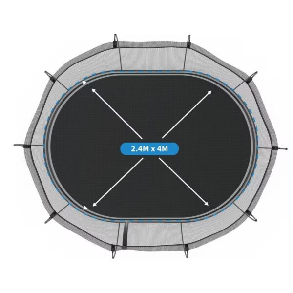 La surface de saut de notre trampoline Grand Ovale O92 de 2,4 x 4m est équivalente à un trampoline de 3x 4,6m avec ressorts