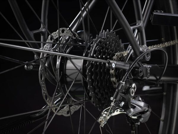 Les composants sont intégrés harmonieusement pour un design élégant. Les câbles sont acheminés en interne, ce qui améliore l’apparence et la durabilité. Le vélo reste propre et minimaliste malgré ses nombreuses fonctionnalités. Le poids léger facilite la manœuvrabilité en milieu urbain dense.