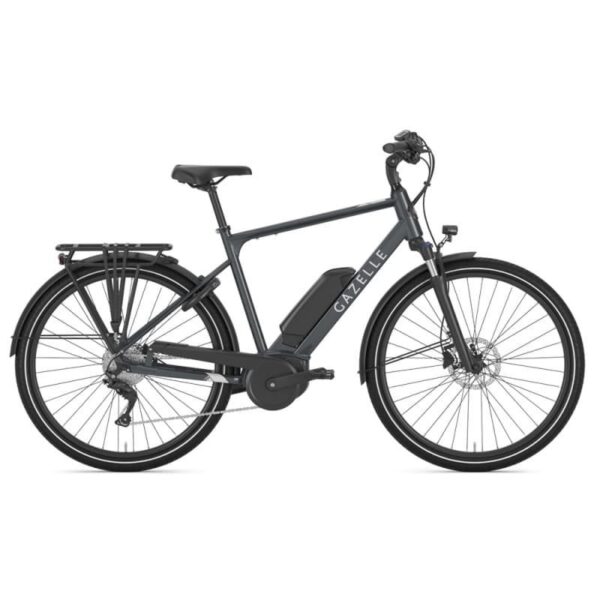 Ce VTC électrique Gazelle Medeo T9 HMB existe aussi en 2 versions : cadre diamant (batterie positionnée sur le tube diagonal) et cadre trapèze (batterie intégrée au porte-bagages). Les roues sont au format habituel (28″) et la fourche offre 50 mm de débattement.