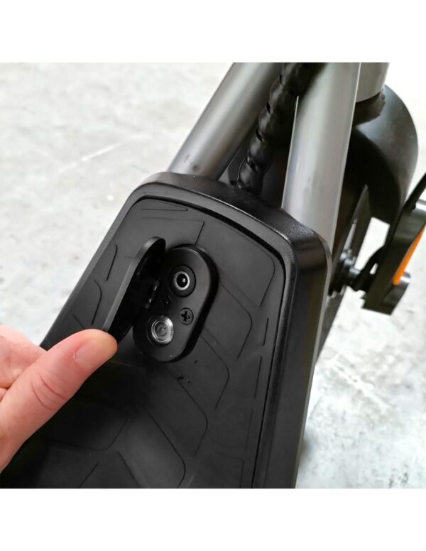 Son système de pliage est ingénieux et pratique. Doté d’une double sécurité facile et pratique à activer, la colonne de direction se replie et se fixe sur le garde-boue arrière pour permettre de transporter le produit lors des déplacements intermodaux ou lors de l’arrivée à destination. Une simple pression sur le bouton de relâche situé sur le garde-boue arrière permet de relever la colonne de direction afin de reprendre la route après avoir reverrouiller en un clic la colonne.